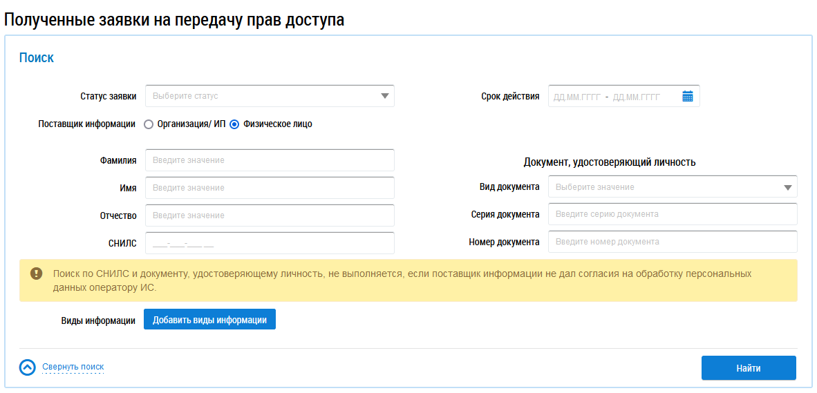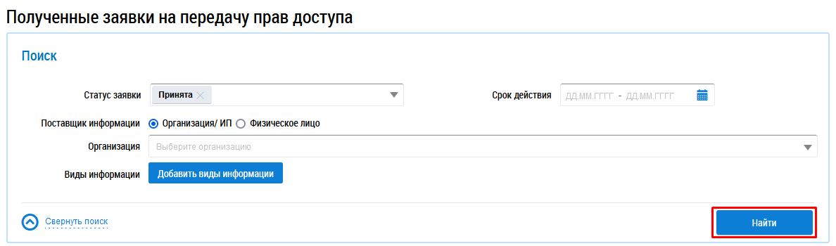 Для осуществления поиска заявок на передачу прав доступа заполните поля блока поиска (Страница «Полученные заявки на передачу прав доступа»).