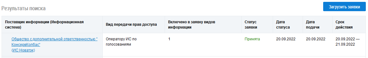 Заявки на передачу прав доступа, отвечающие критериям поиска, отображаются в блоке Результаты поиска.