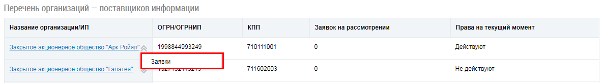 Осуществляется переход на страницу просмотра заявок на передачу прав доступа, полученных от поставщиков информации, для выбранной организации.