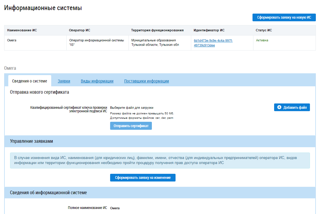 Работа с информационными системами: формирование и отзыв заявки на ИС, просмотр информации об ИС, отправка сертификата ключа.