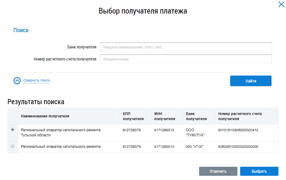Заполните поля блока поиска и нажмите на кнопку Найти. В блоке Результаты поиска установите переключатель напротив необходимого получателя и нажмите на кнопку Выбрать. Информация о получателе добавлена в блоке Информация для внесения платы получателю платежа.