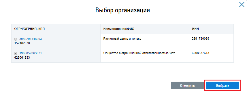 Установите переключатель в столбце ОГРН/ОГРНИП, КПП и нажмите на кнопку Выбрать.