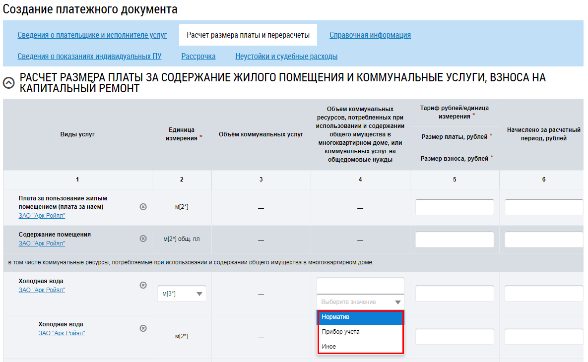 Если выбран один платежный реквизит, то платежный реквизит используется для всех видов коммунальных услуг. В случае, если выбрано несколько платежных реквизитов, то для каждого платежного реквизита доступно указание вида услуги. Сумма к оплате за расчетный период рассчитывается автоматически, на основании выбранных видов услуг.