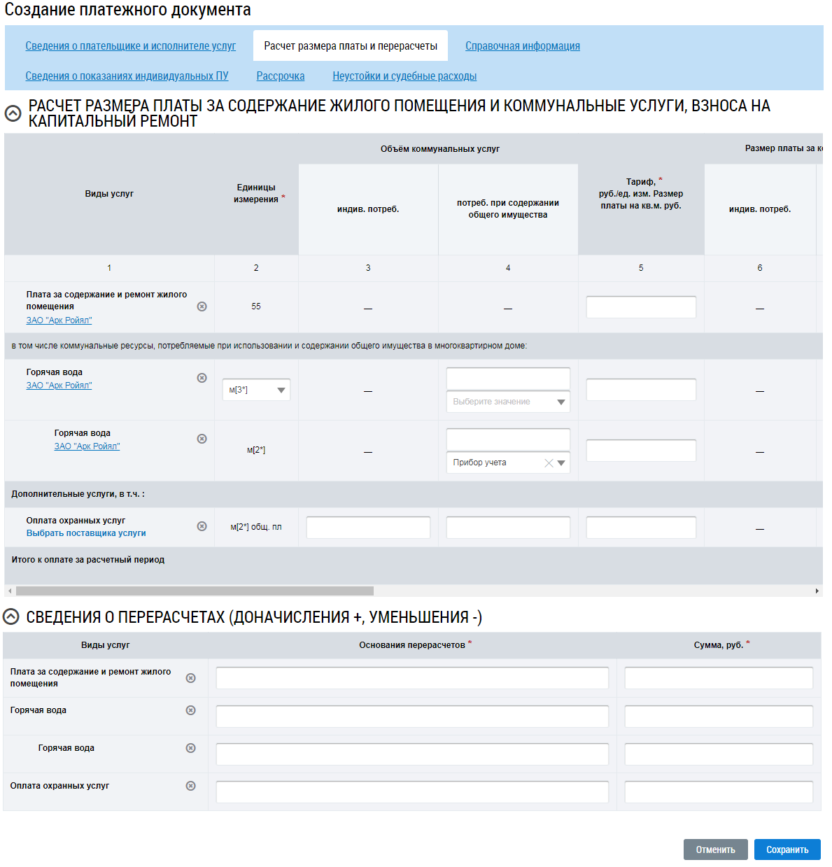 Заполнение вкладки «Расчет размера платы и перерасчеты»