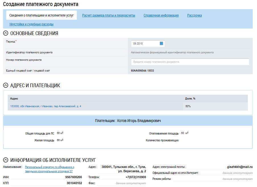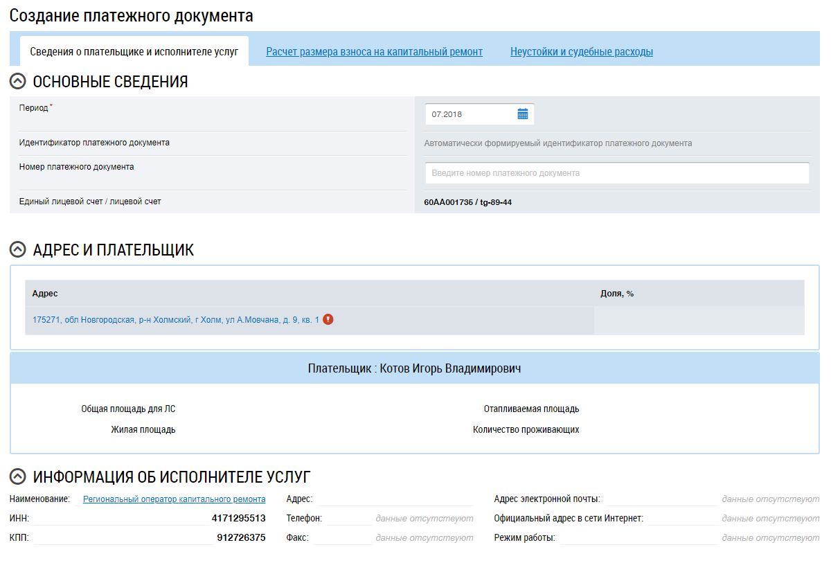 Если у организации в п. Настройки организации не были установлены настройки создания платежного документа на основе ранее размещенного, то отображается страница Создание платежного документа на вкладке Сведения о плательщике и исполнителе услуг.