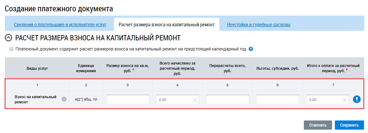 Заполнение вкладки «Расчет размера взноса на капитальный ремонт»