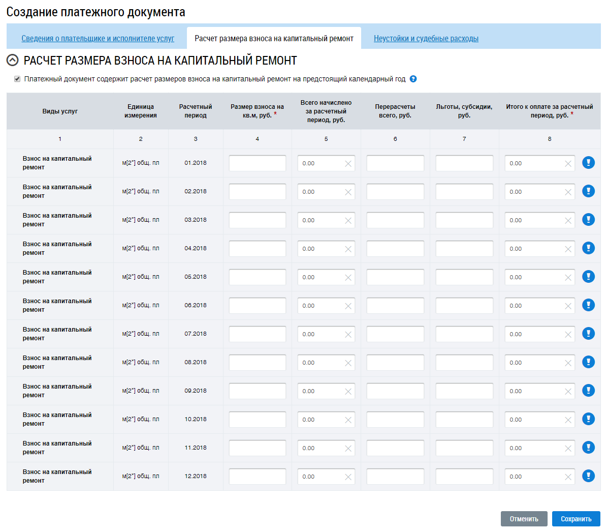В случае, если платежный документ содержит расчет размеров взноса на капитальный ремонт на предстоящий календарный год, установите флажок в поле Платежный документ содержит расчет размеров взноса на капитальный ремонт на предстоящий календарный год. Отображаются дополнительные для заполнения поля, соответствующие каждому месяцу предстоящего календарного года.