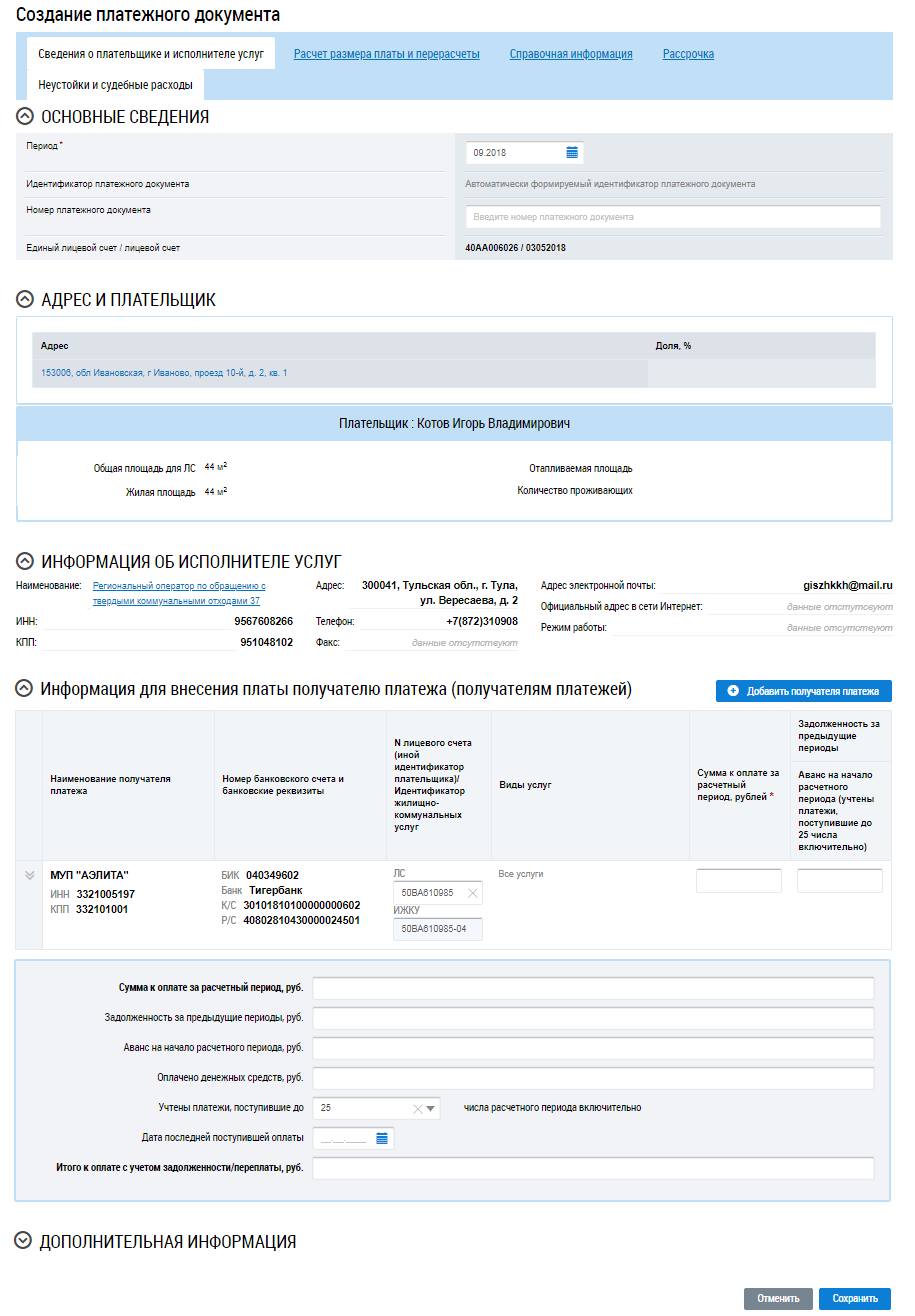 К лицевому счету можно создать до девяти платежных документов в одном расчетном периоде. Добавить дополнительный платежный документ к лицевому счету можно при условии, если ранее созданный платежный документ находится в статусе Размещен.