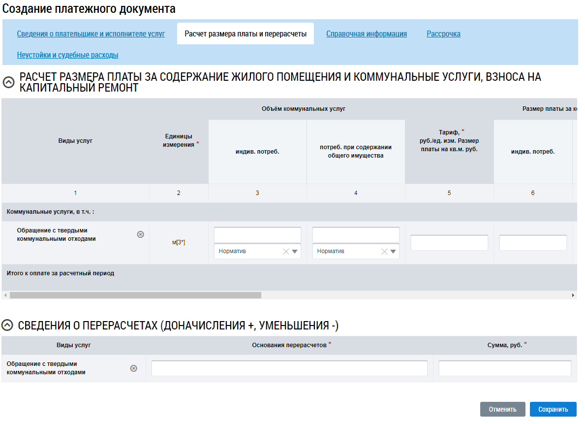 Если в платежном документе по услуге указываются только сведения о перерасчете, в графе Тариф по данной услуге в разделе Расчет размера платы за содержание и ремонт жилого помещения и коммунальные услуги необходимо проставить ноль.