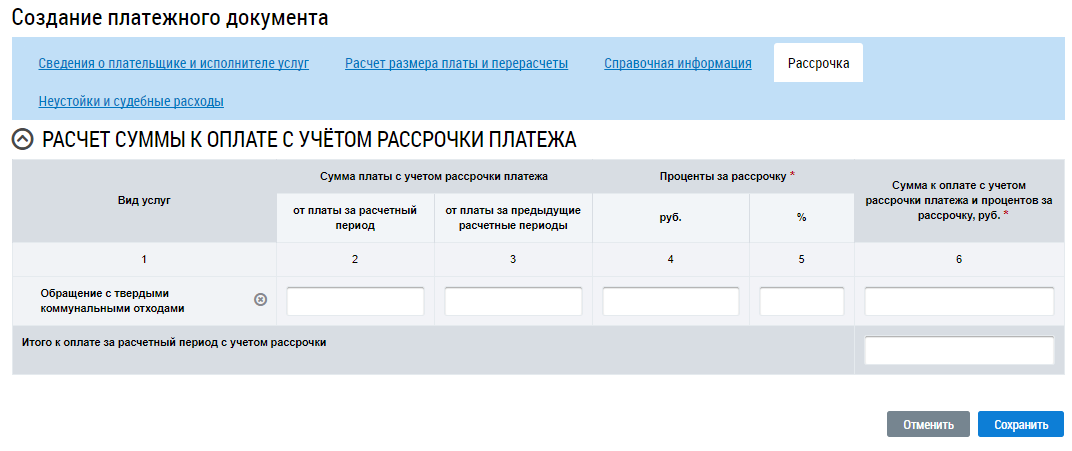 Введите сведения о рассрочке по услуге или удалите строку, нажав на пиктограмму «