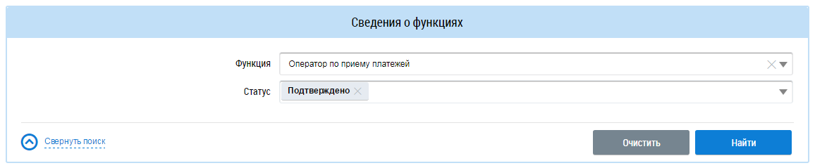 Для заполнения полей Функция и Статус следует выбрать значения из выпадающих списков. После ввода параметров поиска нажмите кнопку Найти.