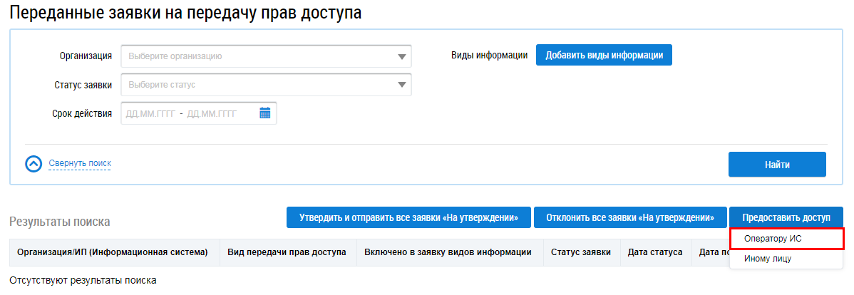 Для формирования заявки на предоставление прав доступа Оператору ИС нажмите на кнопку Предоставить доступ на странице Переданные заявки на передачу прав доступа и выберите в контекстном меню пункт Оператору ИС.