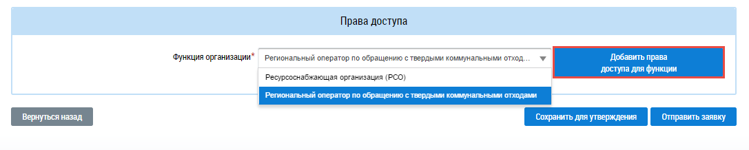Заполните блок Права доступа. В случае наличия у организации нескольких функций выберите в выпадающем списке поля Функция организации необходимое значение и нажмите на кнопку Добавить права доступа для функции. Если у организации одна функция, данное поле не отображается.