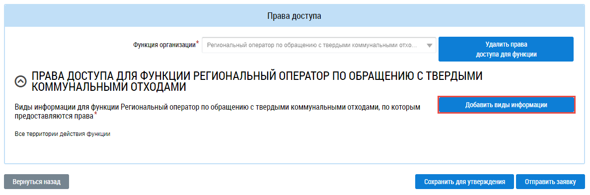 Укажите виды информации, по которым предоставляются права. Для добавления видов информации нажмите на кнопку Добавить виды информации.
