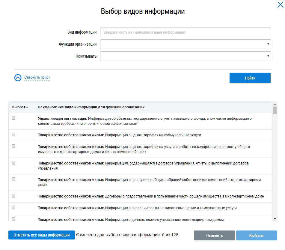 Установите флажки напротив необходимых видов информации или нажмите на кнопку Отметить все виды информации и нажмите на кнопку Выбрать (Окно «Выбор видов информации»).