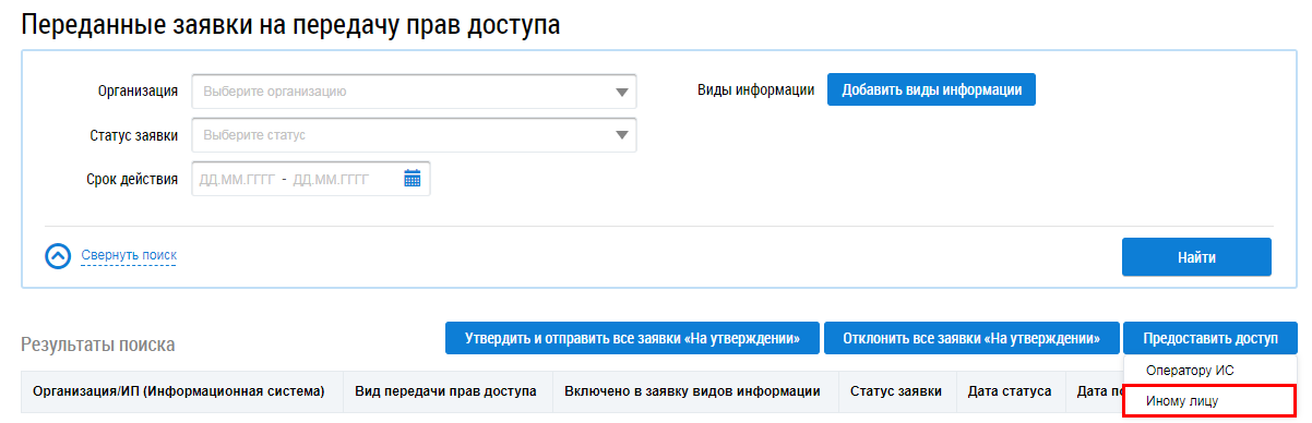 Для формирования заявки на предоставление прав доступа иному лицу нажмите на кнопку Предоставить доступ на странице Переданные заявки на передачу прав доступа и выберите в контекстном меню пункт Иному лицу.
