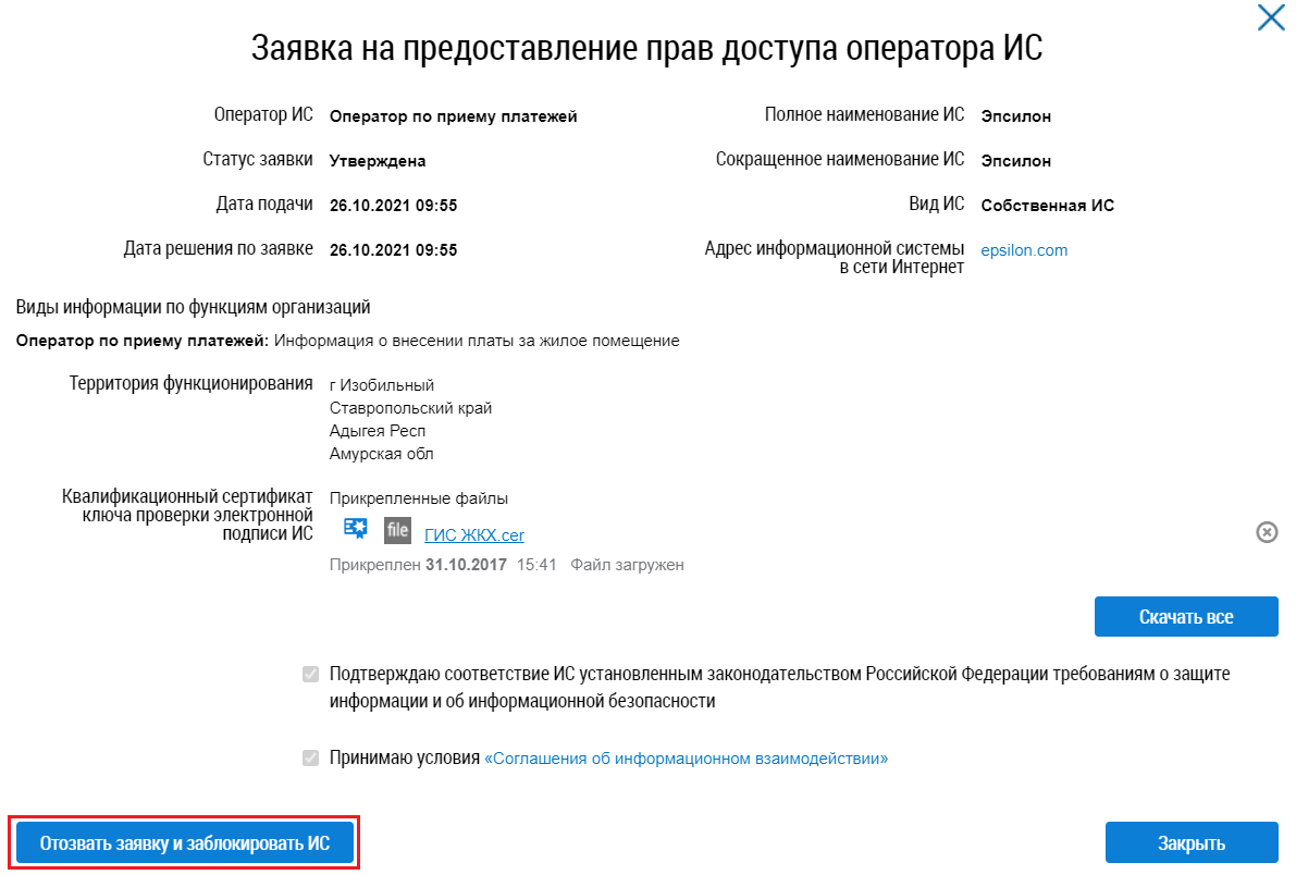 Система предоставляет возможность отозвать заявку и сразу заблокировать информационную систему. Операция отзыва заявки и блокировки ИС доступна для ИС в статусе Активна.