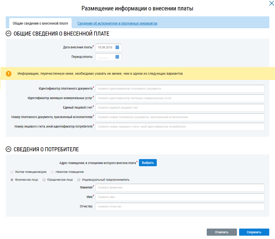 При вводе сведений об оплате часть данных о потребителе и исполнителе услуг заполняется автоматически из платежного документа, определенного по указанному идентификатору платежного документа, либо по идентификатору ЖКУ.