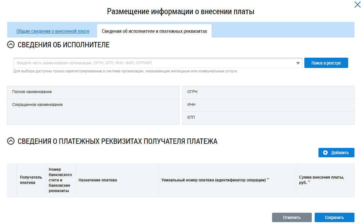 При необходимости внесения платы сразу по нескольким получателям платежа снова нажмите на кнопку Добавить (Окно «Размещение информации о внесении платы», вкладка «Сведения об исполнителе и платежных реквизитах») и повторите процедуру добавления информации о платежных реквизитах.