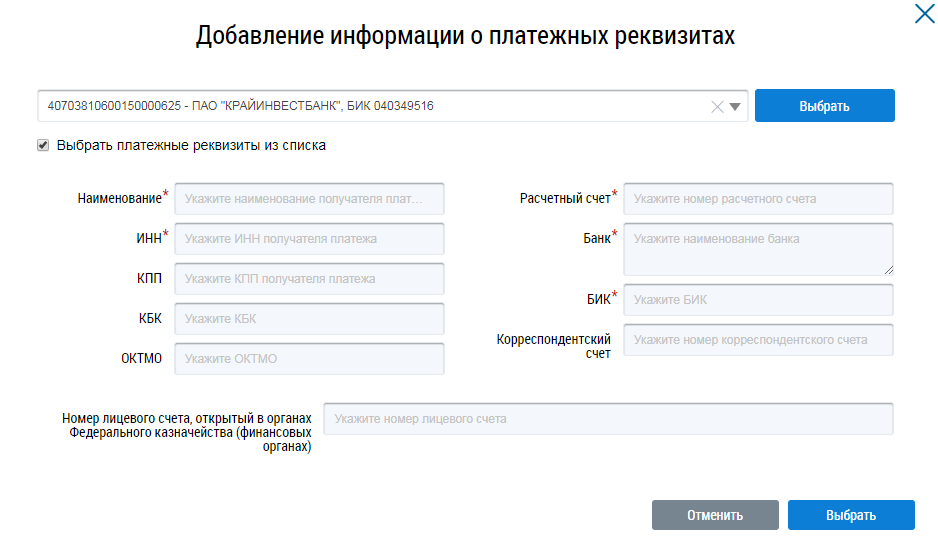 Из выпадающего списка выберите платежные реквизиты исполнителя услуг или нажмите на кнопку Выбрать и выберите реквизиты из справочника. При необходимости снимите флажок Выбрать платежные реквизиты из списка и введите реквизиты вручную, заполнив соответствующие поля. Нажмите на кнопку Выбрать для завершения добавления информации о реквизитах. Отображается вкладка Сведения об исполнителе и платежных реквизитах с заполненными сведениями о платежных реквизитах получателя платежа.