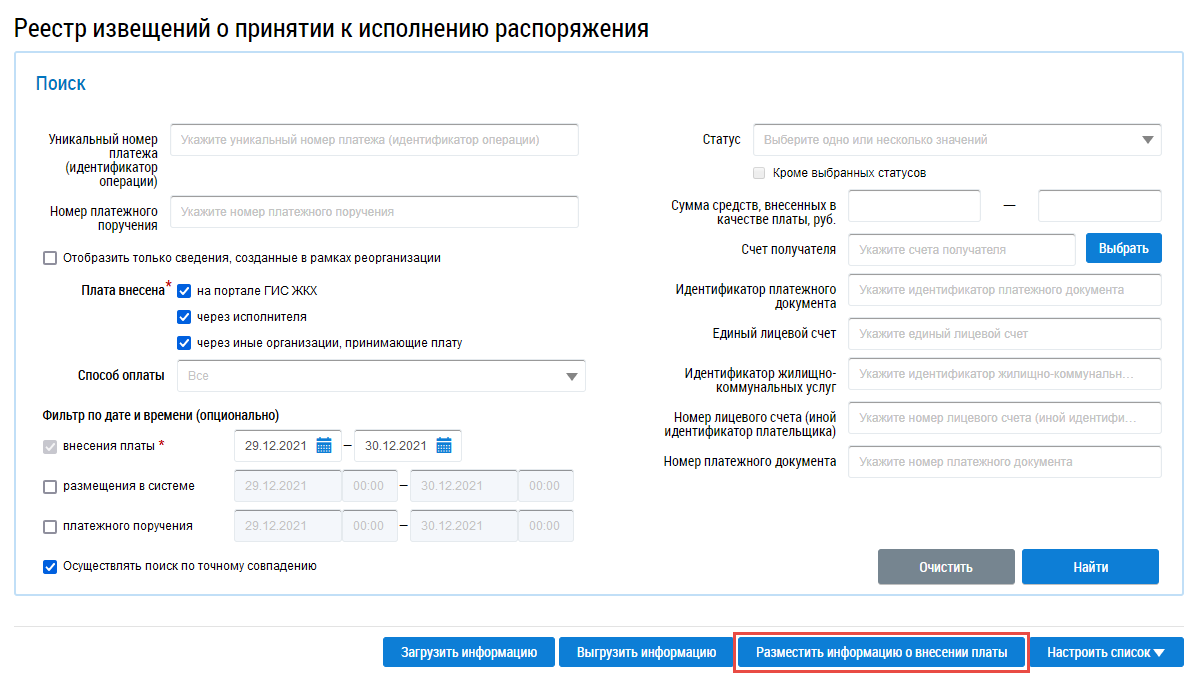 Для размещения информации о внесении платы, нажмите на кнопку Разместить информацию о внесении платы.