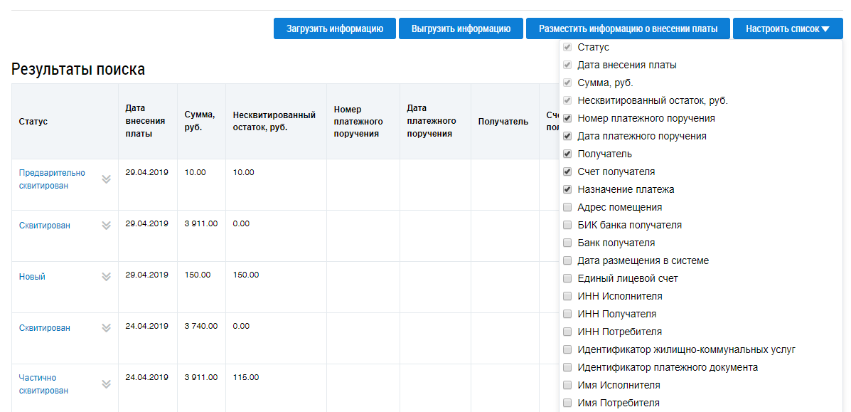 Для настройки параметров отображения информации на странице нажмите на кнопку Настроить список и установите флажки напротив интересующих вас позиций.