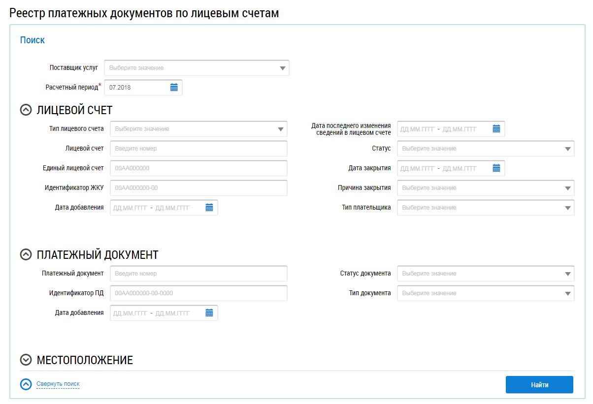 Конкретизируйте поисковый запрос, заполнив поля блоков Лицевой счет и Платежный документ.