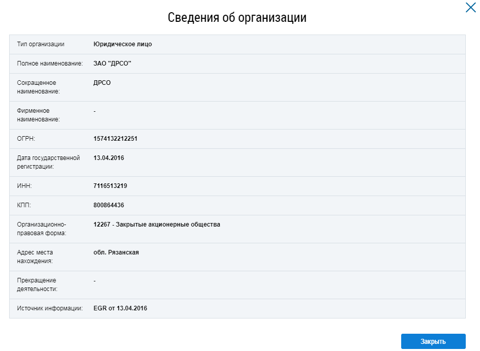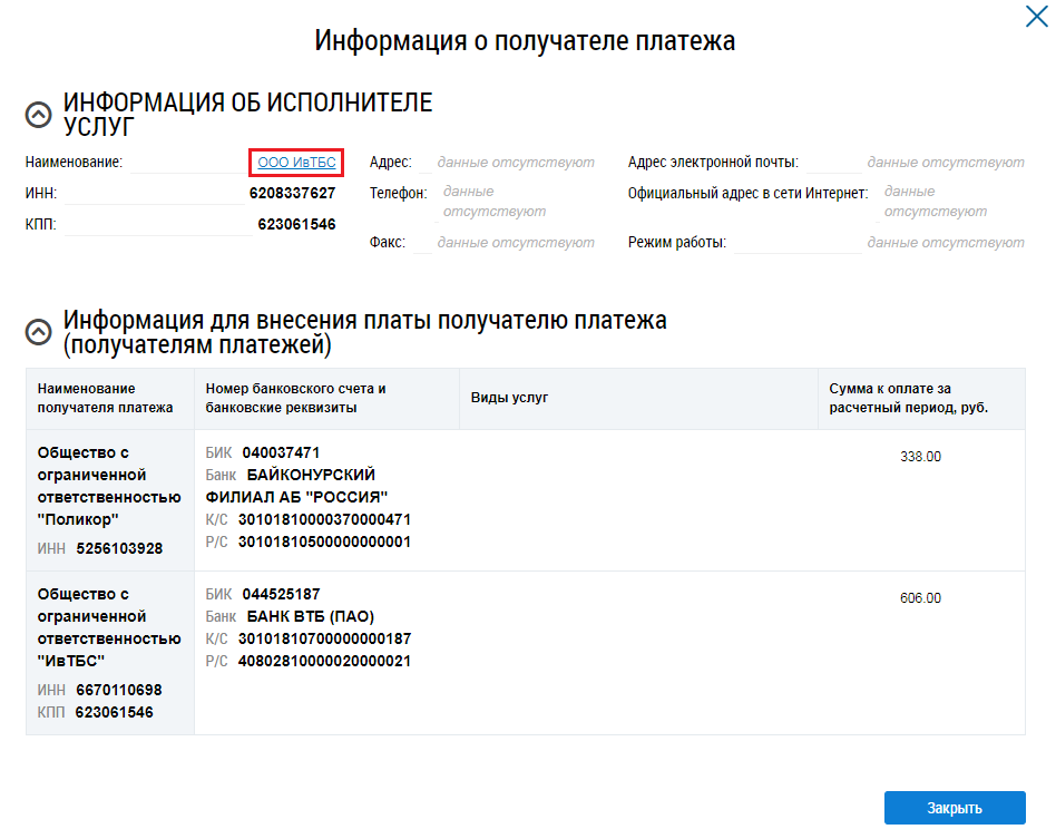 Для просмотра информации об исполнителе услуг нажмите на гиперссылку с наименованием исполнителя (Окно «Информация о получателе платежа». Гиперссылка с наименованием исполнителя услуг). Отображается окно Сведения об организации.