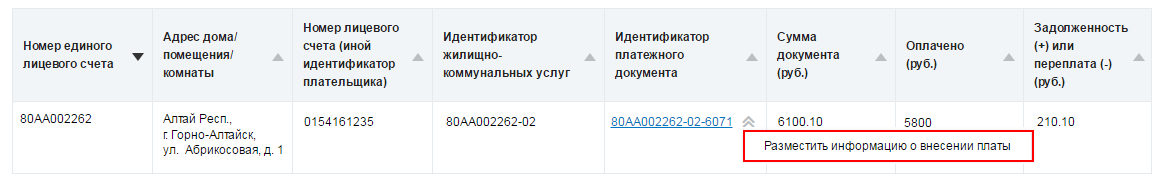 Для перехода к форме размещения информации о внесении платы раскройте контекстное меню идентификатора платежного документа и выберите пункт Разместить информацию о внесении платы.