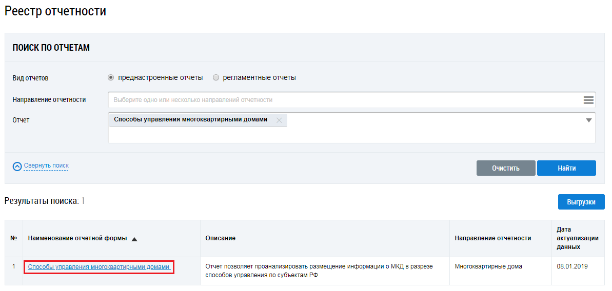 Для перехода на страницу Размещение информации о многоквартирных домах в разрезе способов управления установите переключатель Преднастроенные отчеты (см. Раздел меню «Аналитика и отчеты»). Затем нажмите на гиперссылку с наименованием отчета Способы управления многоквартирными домами.