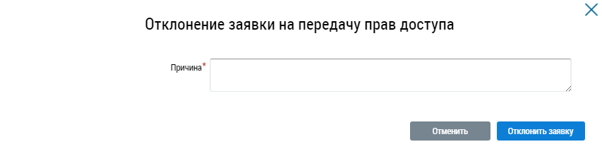 В отобразившемся окне Отклонение заявки на передачу прав доступа введите причину и нажмите на кнопку Отклонить заявку.