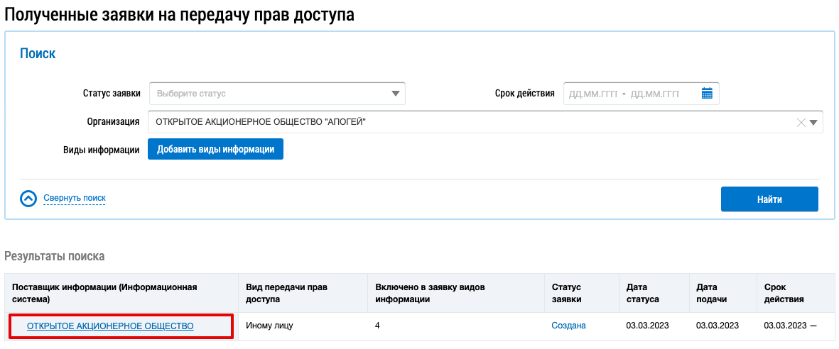 Чтобы отклонить заявку на предоставление прав доступа, перейдите на страницу Полученные заявки на передачу прав доступа и нажмите на гиперссылку с наименованием информационной системы со статусом заявки Создана.