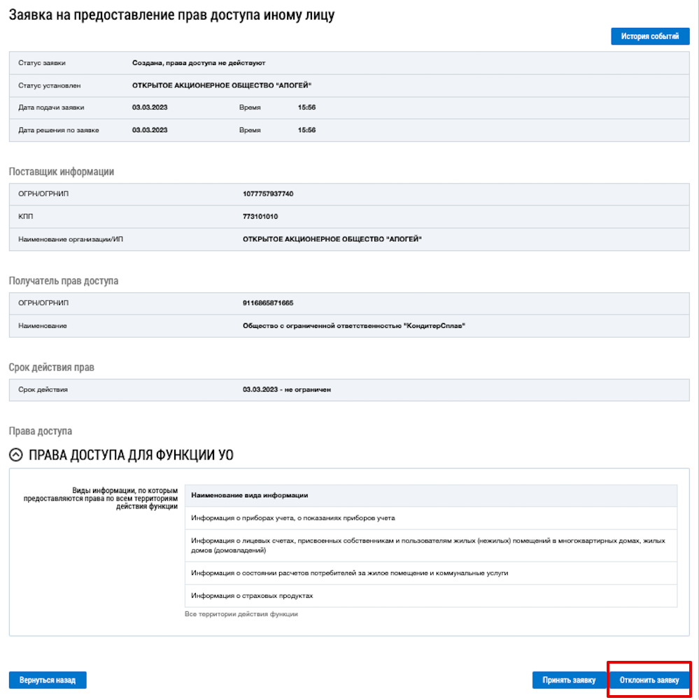 Для отклонения заявки на передачу прав доступа нажмите на кнопку Отклонить заявку.