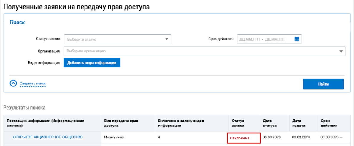 Заявка на передачу прав доступа переходит в статус Отклонена.