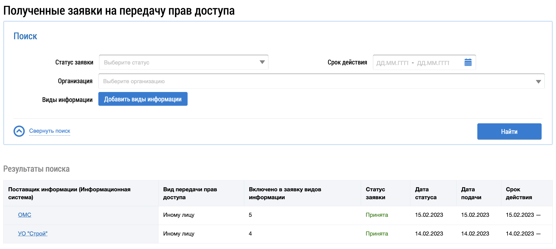 Для просмотра заявок на предоставление прав доступа в блоке Администрирование выберите пункт Поставщики информации и нажмите на подпункт Заявки на предоставление прав доступа (см. Поставщики информации).