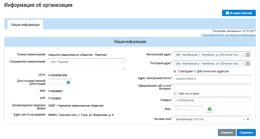 При необходимости внесите изменения в указанные выше поля. Если почтовый адрес совпадает с фактическим адресом, установите флажок Совпадает с фактическим адресом. Если организация не имеет собственного сайта, установите флажок Сайт отсутствует.