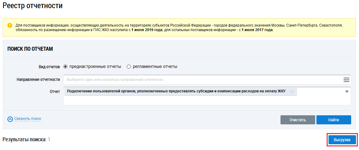 В сообщении нажмите на гиперссылку Реестре отчетности. Отображается страница Реестр отчетности. Нажмите на кнопку Выгрузки.