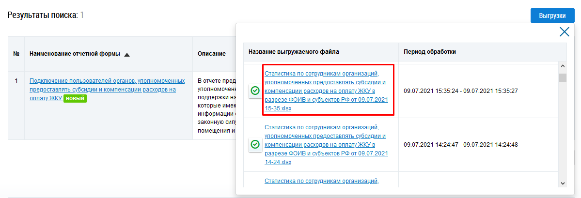 Отображается экранная форма, содержащая обработанные выгрузки. Нажмите на гиперссылку с названием отчета.