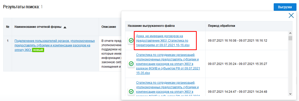 Отображается экранная форма, содержащая обработанные выгрузки. Нажмите на гиперссылку с названием отчета.