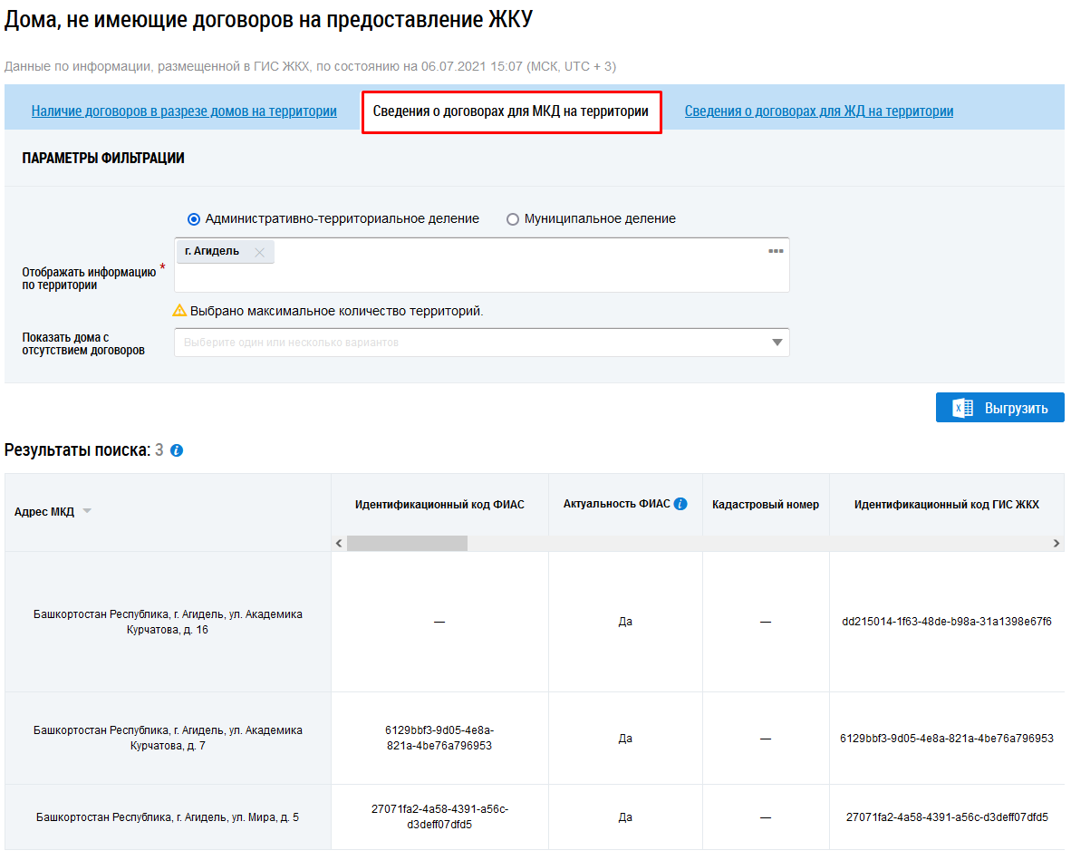 Рис. 2. Страница «Дома, не имеющие договоров на предоставление ЖКУ», вкладка «Наличие договоров в разрезе домов на территории»