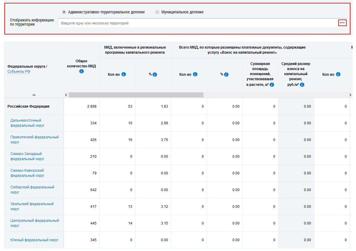 Рис. 4. Фрагмент страницы «Информация о размере взносов на капитальный ремонт», поле «Отображать информацию по территории»