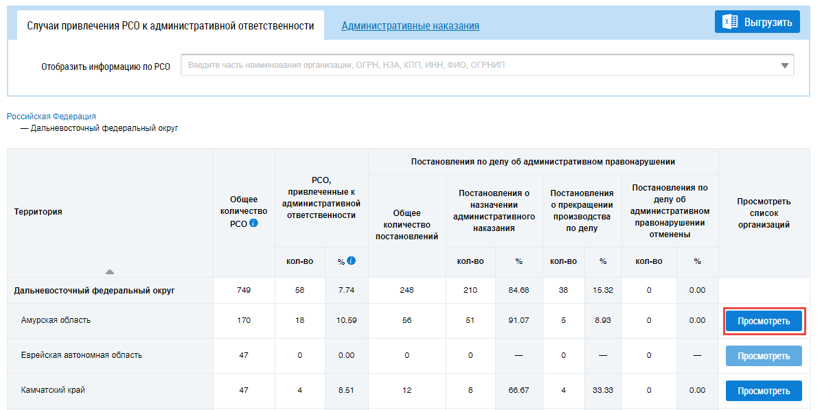 Для отображения информации об организации в таблице в поле «Отобразить информацию по РСО» введите фрагмент названия, ОГРН, НЗА, КПП, ИНН, ФИО или ОГРНИП . Поисковый запрос должен содержать не менее пяти символов. Данный фильтр ищет информацию как в таблице Случаи привлечения РСО к административной ответственности, так и в таблице Административные наказания.