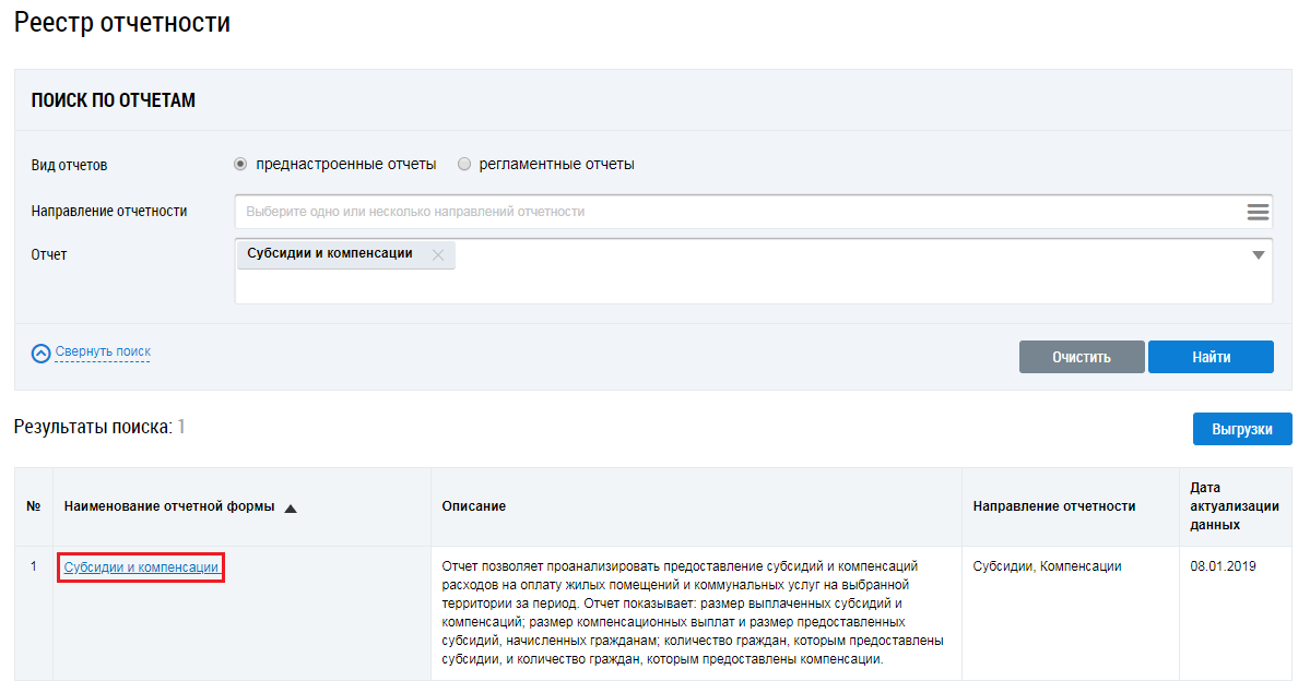Для перехода на страницу Предоставление субсидий и компенсаций расходов на оплату жилых помещений и коммунальных услуг установите переключатель Вид отчетов в положение Преднастроенные отчеты. Затем нажмите на гиперссылку с наименованием отчета Cубсидии и компенсации.