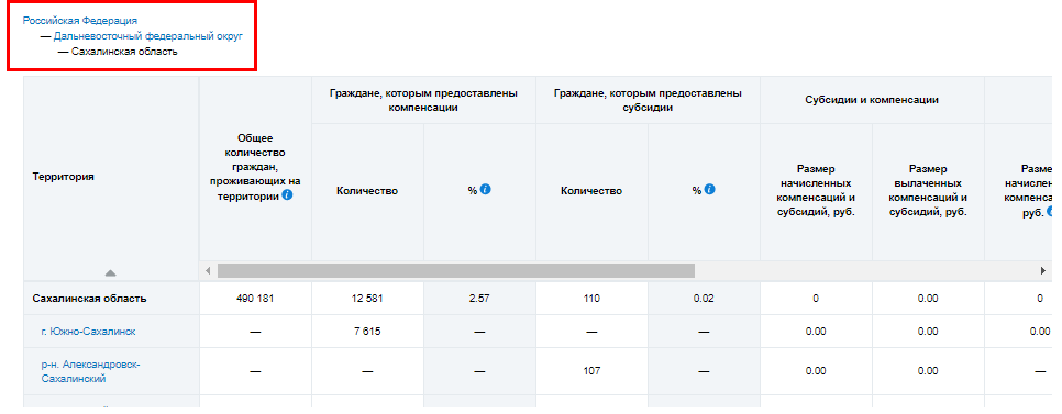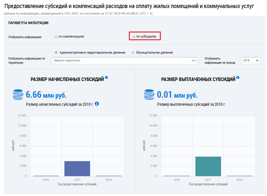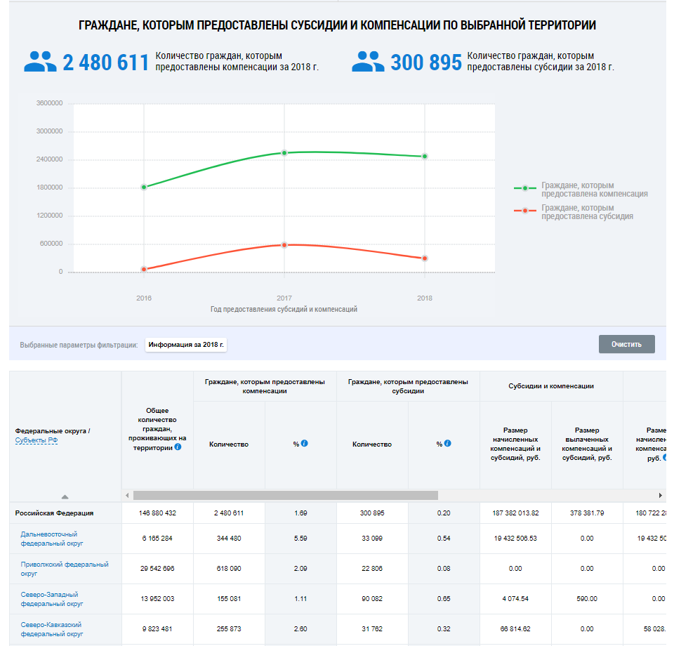 Под блоком поиска представлены три диаграммы, которые содержат информацию о размере начисленных субсидий/компенсаций; о размере выплаченных субсидий/компенсаций; о гражданах, которым предоставлены субсидии/компенсации по выбранной территории.