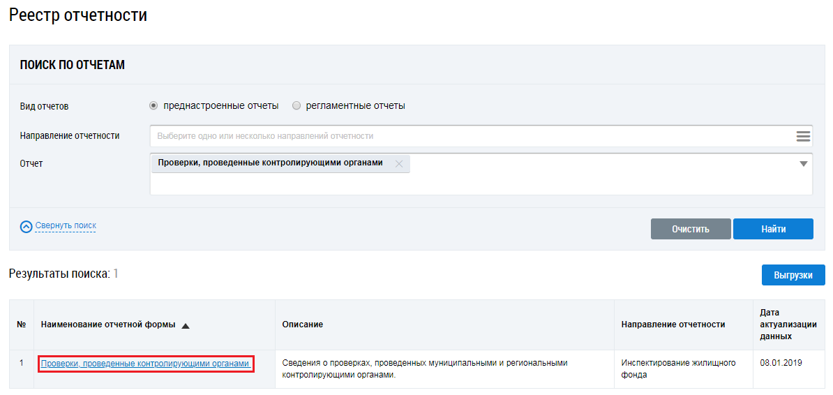 Для перехода на страницу Информация о проверках, проведенных муниципальными и региональными контролирующими органами установите переключатель Преднастроенные отчеты (см. Раздел меню «Аналитика и отчеты»). Затем нажмите на гиперссылку с наименованием отчета Проверки, проведенные контролирующими органами.