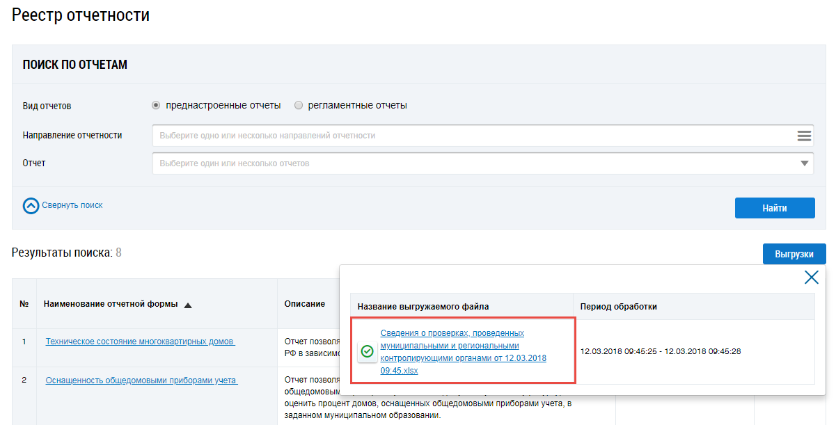 Для сохранения сформированного отчета нажмите на кнопку Выгрузки на странице Реестр отчетности и выберите в выпадающем списке необходимый отчет. Файл отчета хранится в Системе 10 дней.
