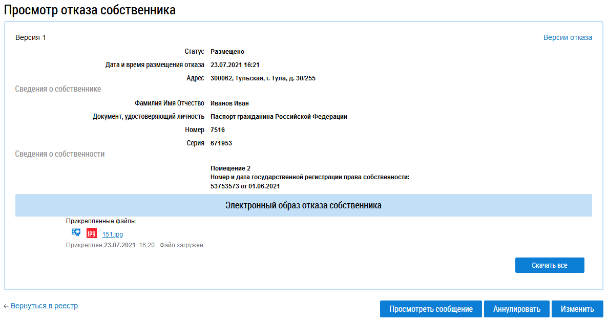 Просмотр отказа собственника