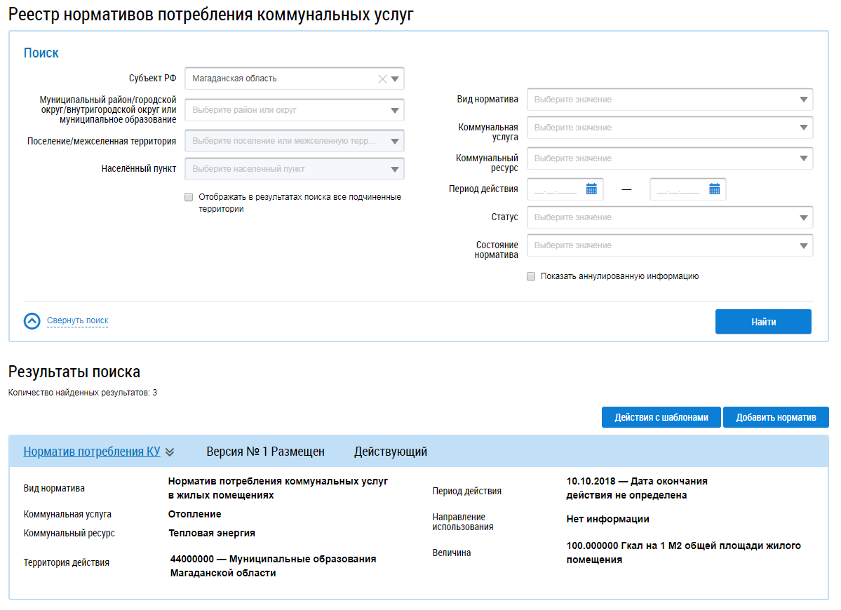 Отображается страница Реестр нормативов потребления коммунальных услуг.