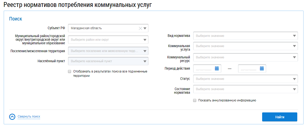 Для поиска нормативов потребления коммунальных услуг заполните поля блока поиска, начиная с