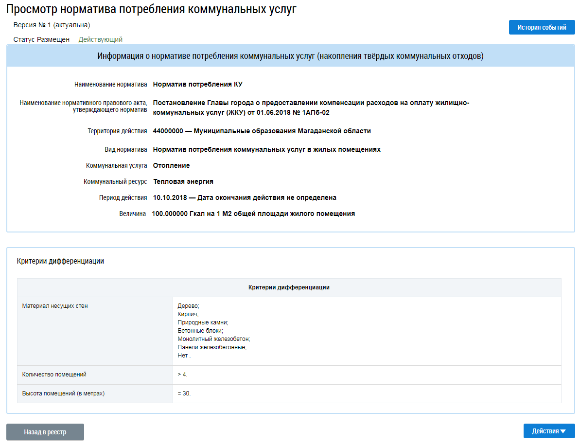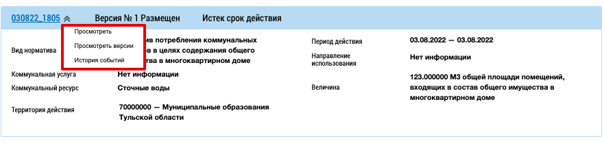 Для просмотра информации о нормативе потребления коммунальных услуг раскройте контекстное и выберите пункт Просмотреть.